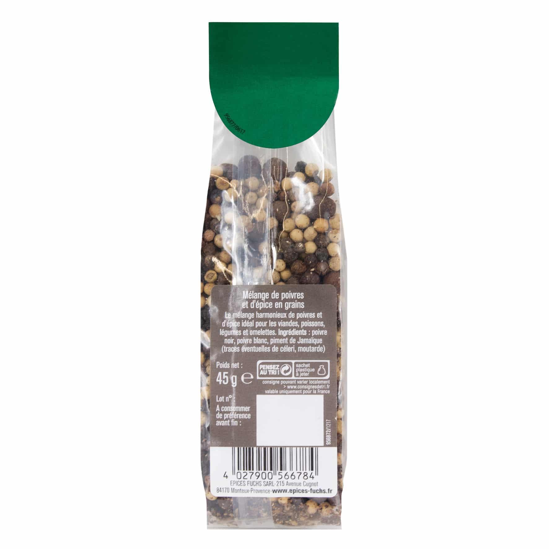 Ingrédients : Mélange de poivres et d'épice en grains : Poivre noir, poivre blanc, piment de Jamaïque (traces éventuelles de céleri, moutarde)